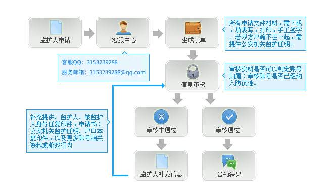 家长监护系统充分考虑家长的实际需求,当家长发现自己的孩子玩游戏过于沉迷的时候,由家长提供合法的监护人资质证明、游戏名称账号、以及 家长对于限制强度的愿望等信息,可对处于孩子游戏沉迷状态的账号采取几种限制措施,解决未成年人沉迷游戏的不良现象,如限制未成年人每天玩游戏的时间区间和长度,也可以限制只有节假日才可以游戏,或者完全禁止。